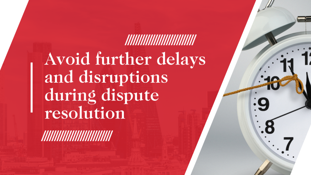 Whatever the extent of the delay and disruption caused it is necessary to prioritise safeguarding the construction programme. This means that the contracting parties must find a way to maintain progress on site while attempting to resolve their differences. This is because stopping work to engage in dispute resolution simply exacerbates the delay to the completion of the project which will invariably have increased cost consequences for all parties.